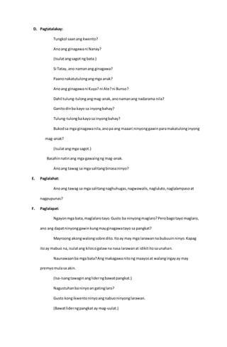 Hanay A Hanay B _____1. Outline EDUKASYON SA PAGPAPAKATAO Pagkamasunurin Obedience 131 Pagsunod kaagad kapag tinawag ng kasapi ng pamilya. Paglalahad Ang Daga at ang Leon May isang malikot na daga na masayang naglalaro.