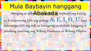 Mula Baybayin hanggang AbakadaIdinagdag sa orihinal na mga titik ng baybayin ang katinig na R at ginawang lima ang patinig. Idinagdag sa orihinal na titik ng baybayin ang katinig na R at ginawang lima. Ang mga sagisag ay ang mga pantig sa Tagalog.