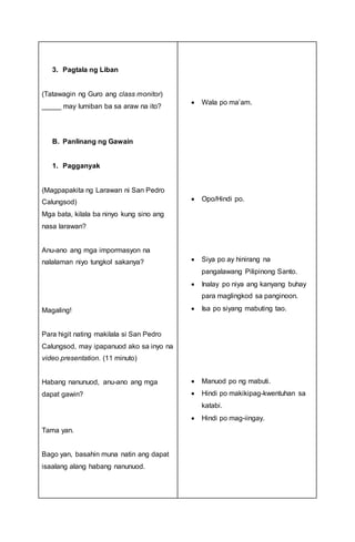 MASUSING BANGHAY SA PAGTUTURO NG ARALING-PANLIPUNAN Ikalawang Baitang I. Bahagi ng Banghay Aralin Layunin Paksang Aralin Pamamaraan Ebalwasyon Takdang Aralin Layunin Dito naipapahayag ang tiyak na pananalita ng mga pagkatuto o gawain na inaasahang maipakita ng mga mag-aaral. Nasasagot ang mga tanong tungkol sa detalye ng kwentong napakinggan 3.