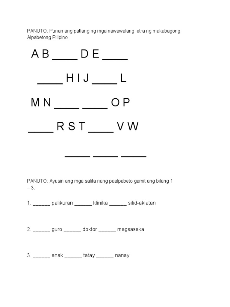 The link below opens a pdf file with 10 worksheets. Isulat ang nawawalang titik ng makabagong alpabetong filipino. Ito ay kumakatawan sa mga makabuluhang tunog na taglay ng isang wika.